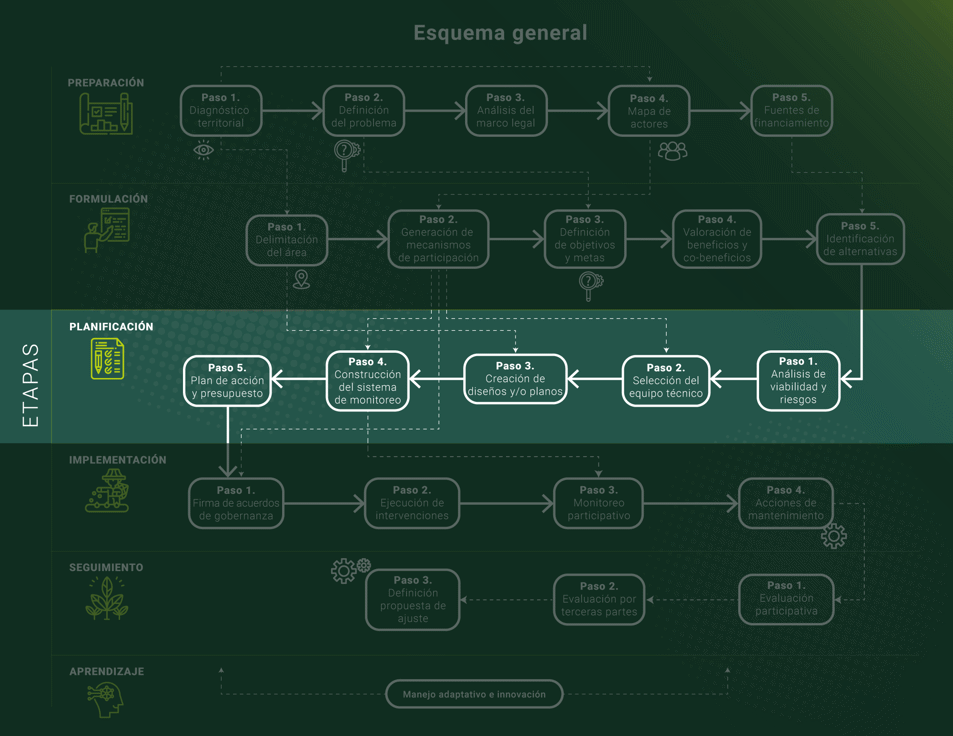 La finalidad de esta etapa es, poder garantizar que los proyectos de SbN se articulen y respondan de manera integral a los desafíos territoriales. Para ello, es necesario comprender cómo son las dinámicas socioecológicas territoriales, cuáles son los marcos legales de acción, quiénes son los actores interesados y con qué recursos financieros se dispone.